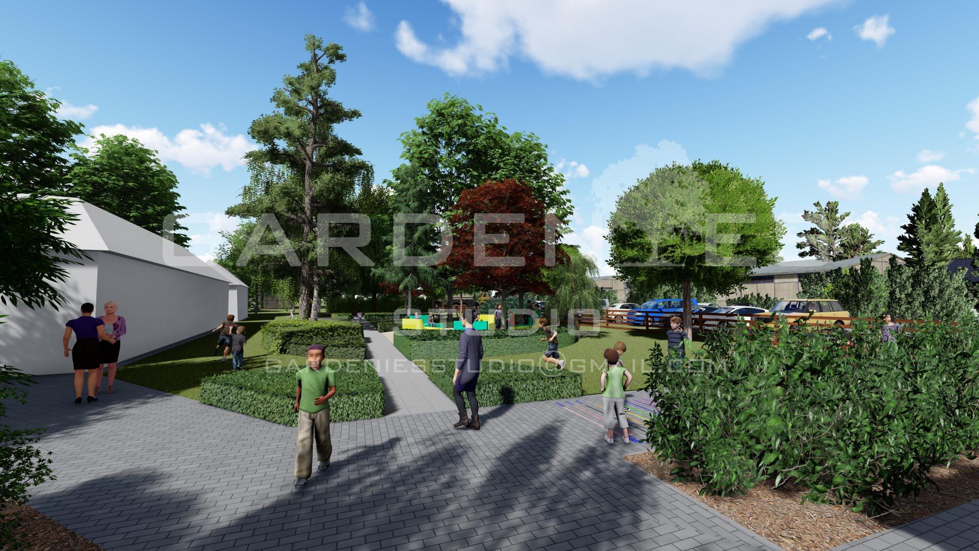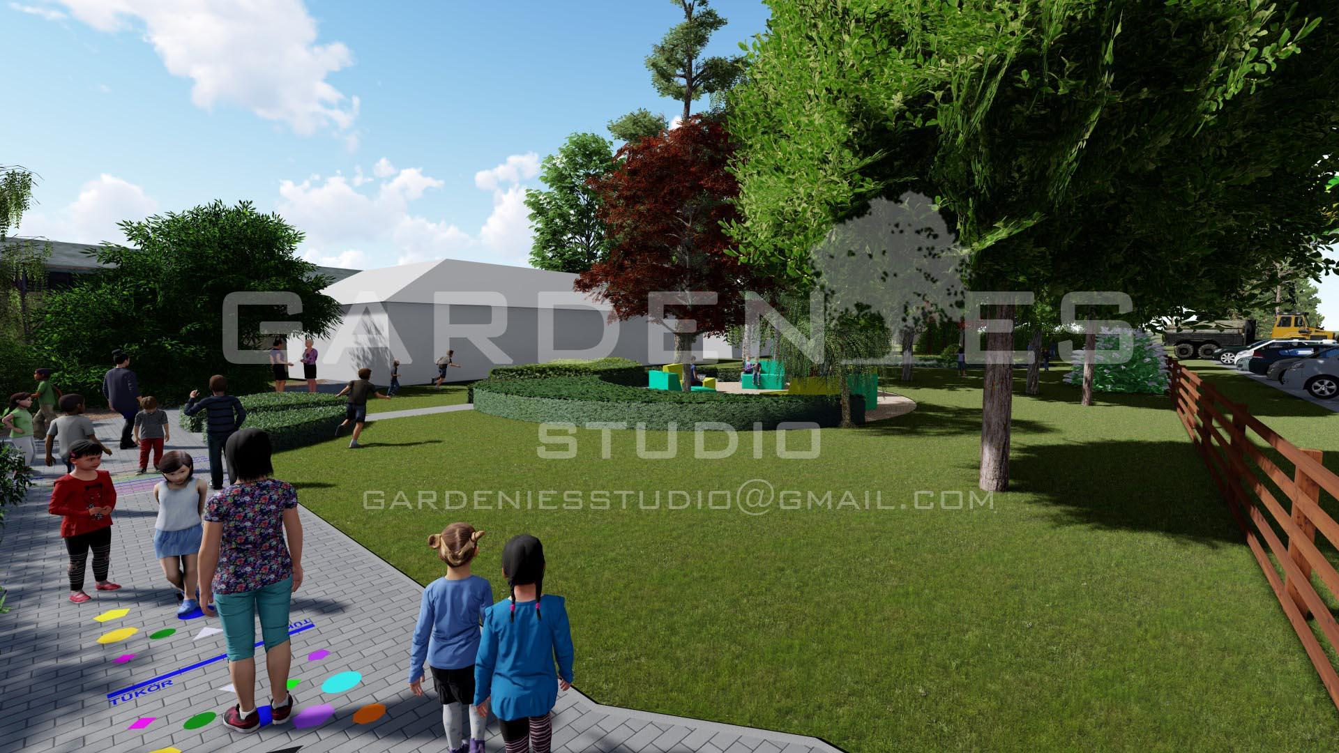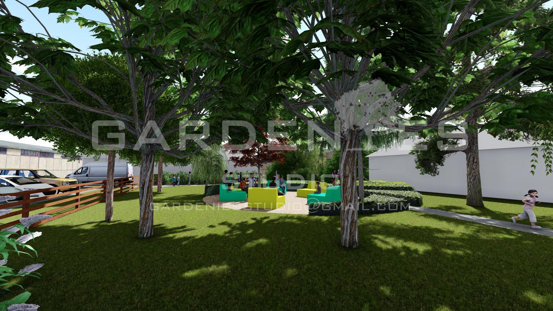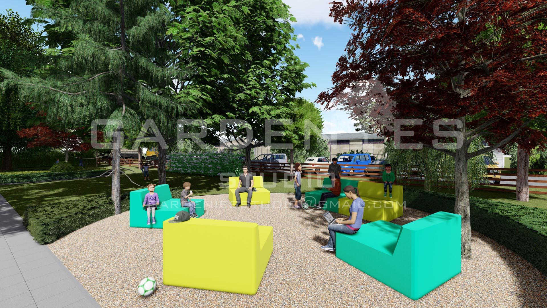 A helyszínen korábban létrehozott közösségi tér funkciót új köntösben, de megőriztem. A kültéri tanóra megtartására is alkalmas területen fiatalos, színes és kevés fenntartást igénylő ülőbútorokat használtam, melyek az órákon kívüli szabadidő eltöltésére is helyet teremtenek a fiataloknak. Az udvarrészen elhelyezésre került 2 db forgó játszóeszköz is, mely az általános iskolai korosztály számára is szórakozást biztosít. Ezen kívül az új burkolatokra festett „táblajátékok” nyújtanak kikapcsolódási-, szórakozási lehetőséget a gyerekeknek.
