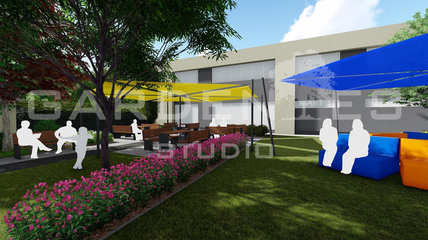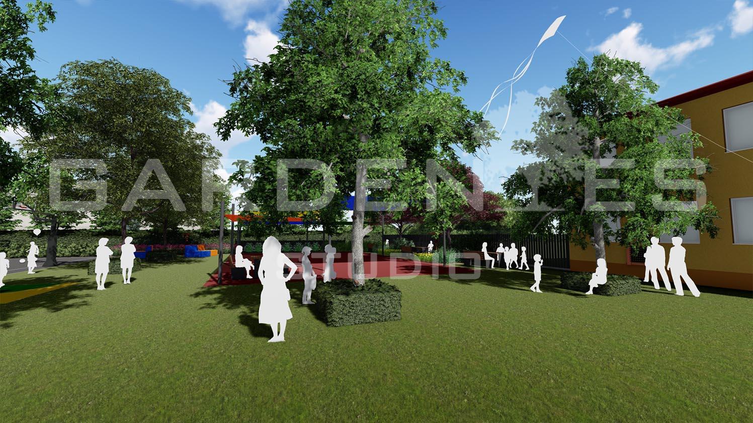 A tervezési feladatom az intézményhez tartozó régi és új iskolaegység közötti udvarrész és az újonnan kialakított parkoló zöldfelületi terveinek elkészítése. A játszóudvaron 3 nagyobb különböző funkciójú területet alakítottam ki. A terület főbejárathoz közelebb eső, déli részén került kialakításra egy kisebb várakozó / közösségi tér. A lapburkolatos területen napvitorlás árnyékolók alatt pad-asztal kombinációk kerültek elhelyezésre. A terület közvetlen kapcsolatba van az új épület déli földszintjén kialakított ebédlővel, így alkalmassá válik kisebb rendezvények megtartására, vagy jó időben az ebédek elfogyasztására. A várakozó tér északi és keleti oldalán egy-egy közösségi pihenő-, beszélgetős területet alakítottam ki. Mindkét helyen napvitorlás árnyékolók alatt vagány, fiatalos, színes, nagyméretű ülőbútorokat és kültéri, mozgatható ping-pong asztalokat helyeztem el. A meglévő épület és az új épület bejárati tengelyében széles, szabad burkolt részt terveztem, mely alkalmas iskolai rendezvények, családi napok megtartására. A nagy egybefüggő burkolatot aszfaltfestésekkel színesítettem.