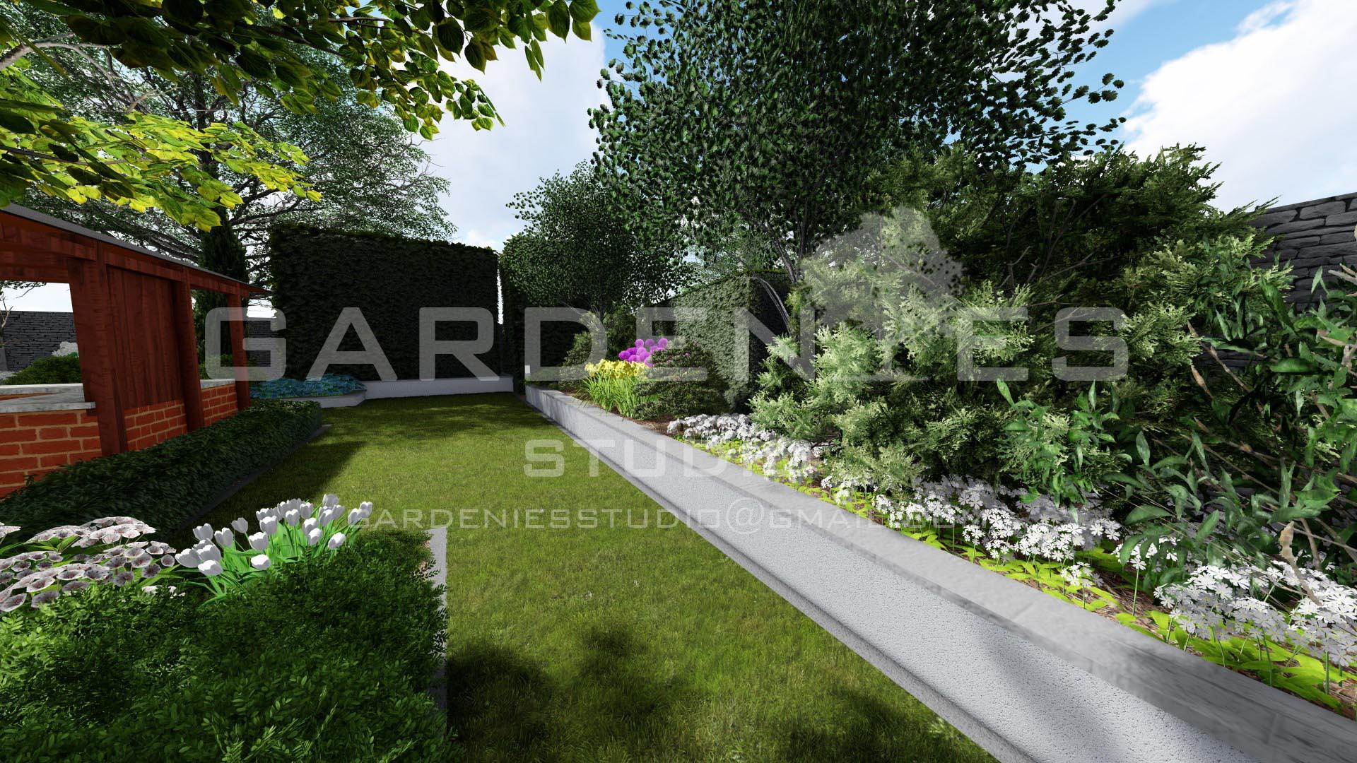Ebben a munkában egy meglévő ház, meglévő kertjének átalakításával bíztak meg. A kertben a burkolatokat, a kerítést és a hátsókertben elhelyezett fedett kerti sütőhelyet megtartották, így ezeket adottságnak tekintettem. A garázs és a lakóház között elhelyezkedő előkertben jól megkomponált vegyes növényágyásokat alakítottam ki a kisebb gyepfelületek mellett. A lakóépület főbejárata előtt oszlopos tiszafákból és vegyes félárnyéki takartakaró évelőkből álló kompozíciót terveztem. A hátsókertben lévő kerti sütőhely körül meghagytam a szabad gyepfelületeket és a kerítés előtt hoztam létre különböző magasságú és szélességű kiemelt ágyásokat. A szomszédos telkek felőli belátást és rálátást a kerítést túlnövő, örökzöld sövénysávokkal és lombtartó cserjesorokkal takartam.